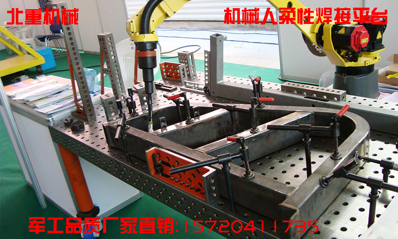 柔性組合工裝夾具是一種三維平面孔系定位夾緊系統(tǒng),采用標(biāo)準(zhǔn)化、系列化、通用化的模塊組成,所有模塊的鏈接、固定和壓緊都是以孔來定位,用鎖緊銷來實(shí)現(xiàn)快速鎖緊,模塊與模塊隨著機(jī)器人的應(yīng)用越來越廣泛,自動(dòng)化程度的不斷提高,傳統(tǒng)的裝配、焊接工藝裝備已經(jīng)很難適應(yīng)生產(chǎn)的要求;經(jīng)過我們不斷的實(shí)驗(yàn)創(chuàng)新,研發(fā)出機(jī)器人焊接平臺(tái),從此提高生產(chǎn)效率、降低生產(chǎn)成本、提高產(chǎn)品質(zhì)量。利用專用夾具附件完成實(shí)現(xiàn)產(chǎn)品的高效率、低成本的生產(chǎn)。