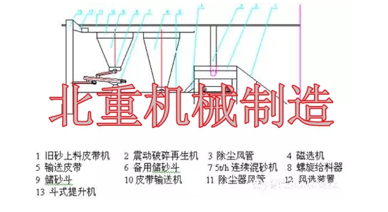 人工落砂后,舊砂通過(guò)上料皮帶機(jī)進(jìn)入振動(dòng)落砂機(jī)完成落砂、破碎、篩分,再生,經(jīng)過(guò)帶由磁選的輸送皮帶進(jìn)入斗式提升機(jī),在輸送過(guò)程中人工加入新砂。在斗提的出口處安裝風(fēng)選裝置,經(jīng)過(guò)風(fēng)選的型砂經(jīng)皮帶輸送機(jī)進(jìn)入儲(chǔ)砂斗。劃線平臺(tái)鑄件生產(chǎn)時(shí),型砂從砂斗經(jīng)螺旋給料器進(jìn)入混砂機(jī)。